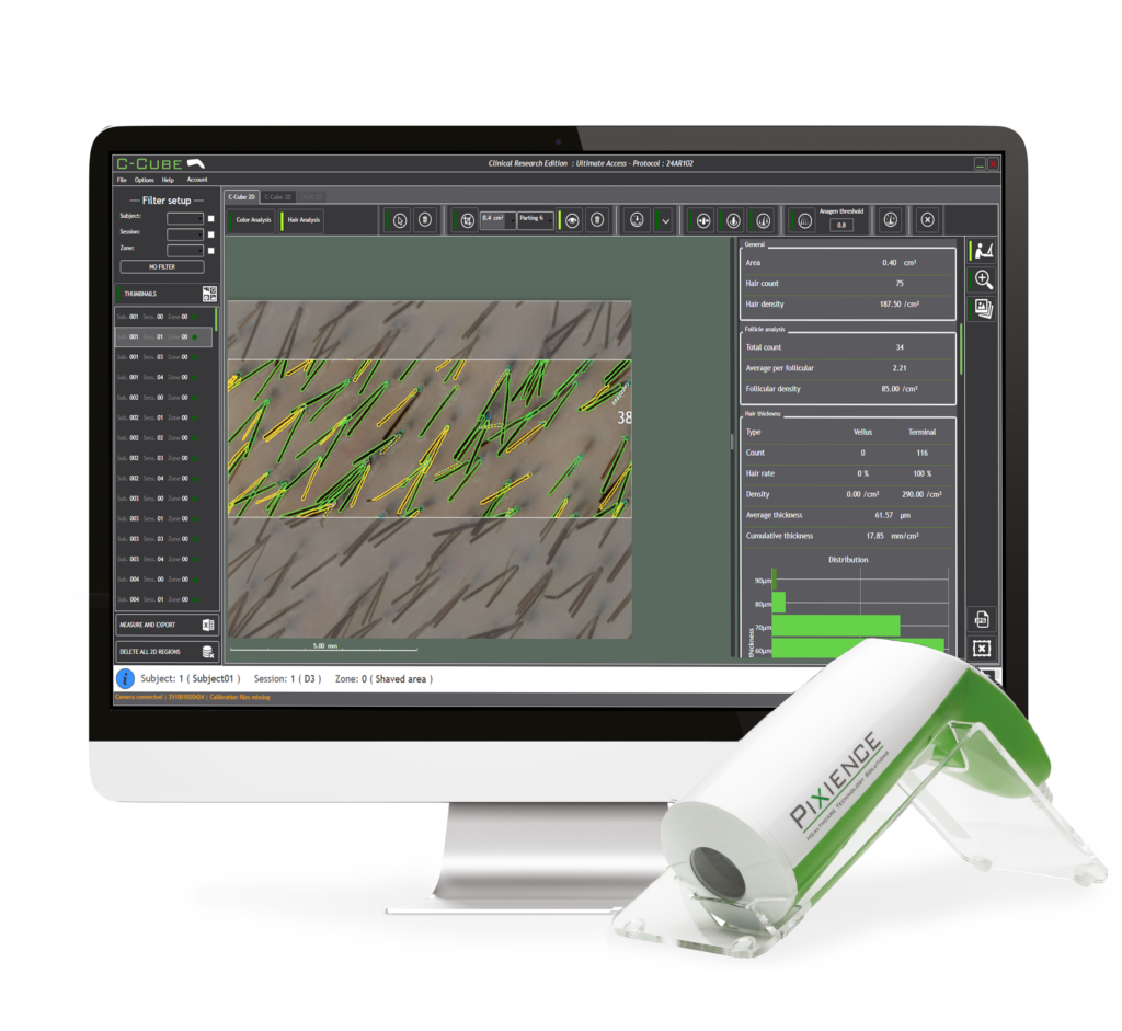 The C-Cube Clinical Research combines calibrated microdermoscopic imaging, 2D and 3D analyses, and automated parameters to document a wide range of cosmetic effects: