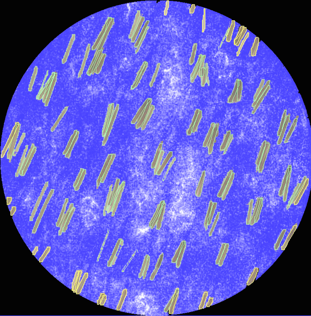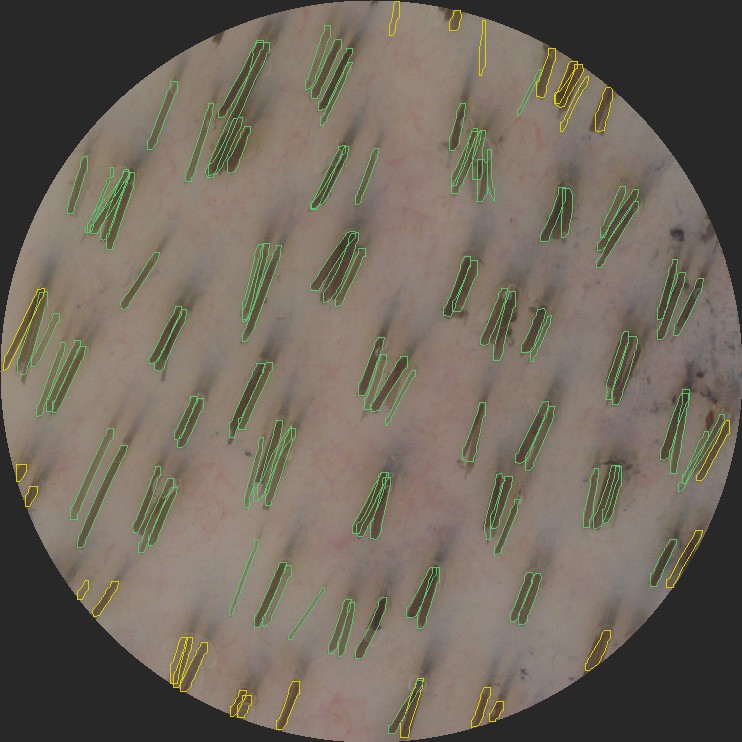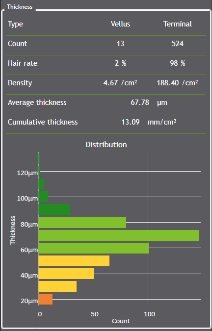 Le mesure du diamètre des cheveux est désormais possible de manière automatique. L’algorithme identifie chaque fibre dans le champ et en calcule le diamètre, permettant de les qualifier comme Vellus ou Terminaux.