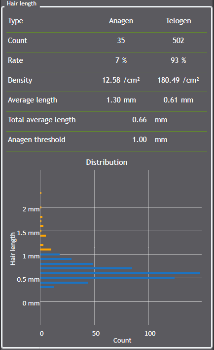 Le C-Cube est également capable d’évaluer la longueur des cheveux automatiquement à partir d’une image. Chaque fibre détectée est mesurée de manière individuelle, ce qui permet de quantifier précisément la croissance capillaire sur une zone définie, et le taux d’anagènes et télogènes. Cette analyse est pertinente dans le cadre d’études sur la repousse ou pour comparer l’état du cheveu avant et après intervention.
